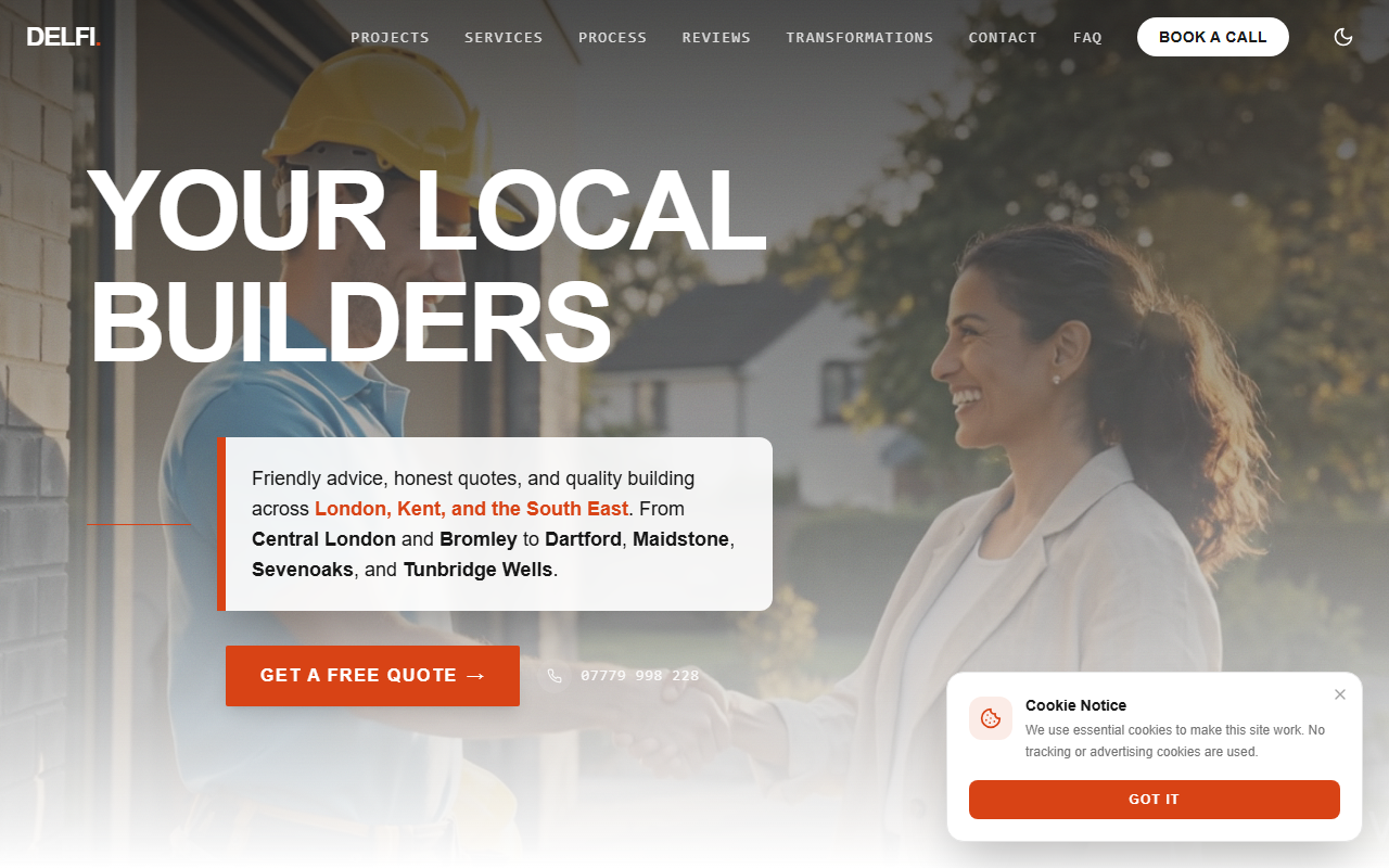 A complete website for a Tunbridge Wells construction company. Modern design, project gallery, and a contact system that delivers enquiries straight to their inbox.